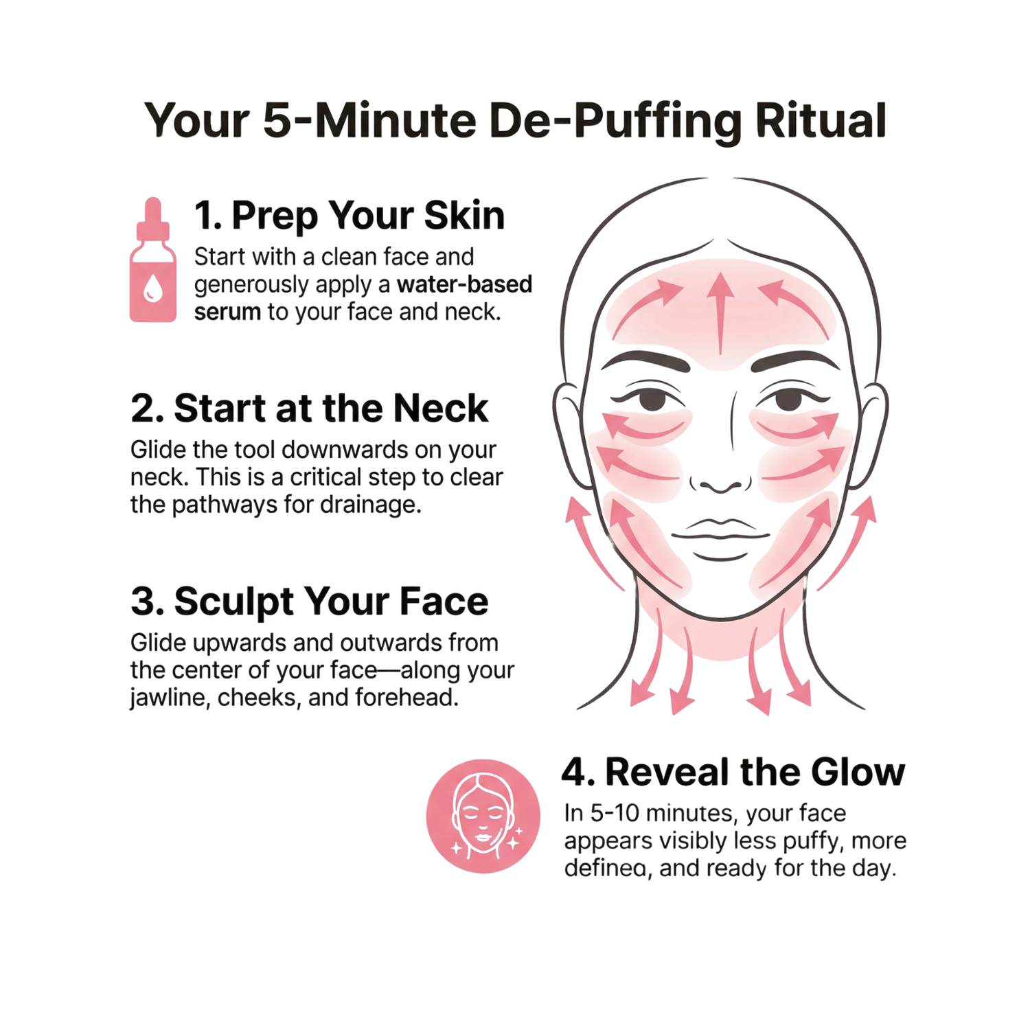 2. Neck First — Glide downward from ear to collarbone for 1–2 minutes. This opens your lymphatic drainage endpoints and makes everything else more efficient.