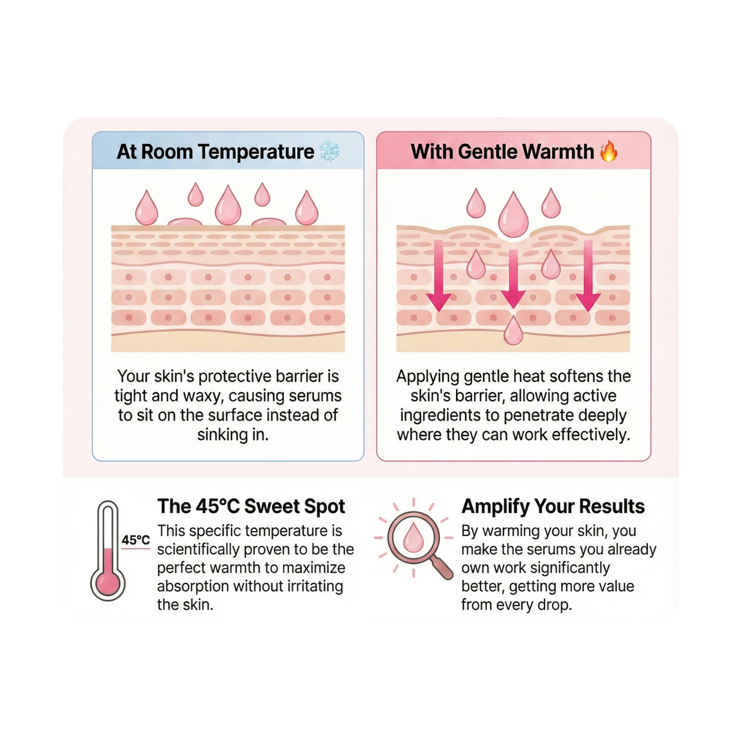 Vera Body maintains a consistent warm temperature, the scientifically validated level that softens your lipid barrier without damage. When your skin warms up, the barrier temporarily softens, and active molecules finally penetrate. Your retinol works. Your vitamin C works. Your peptides work.