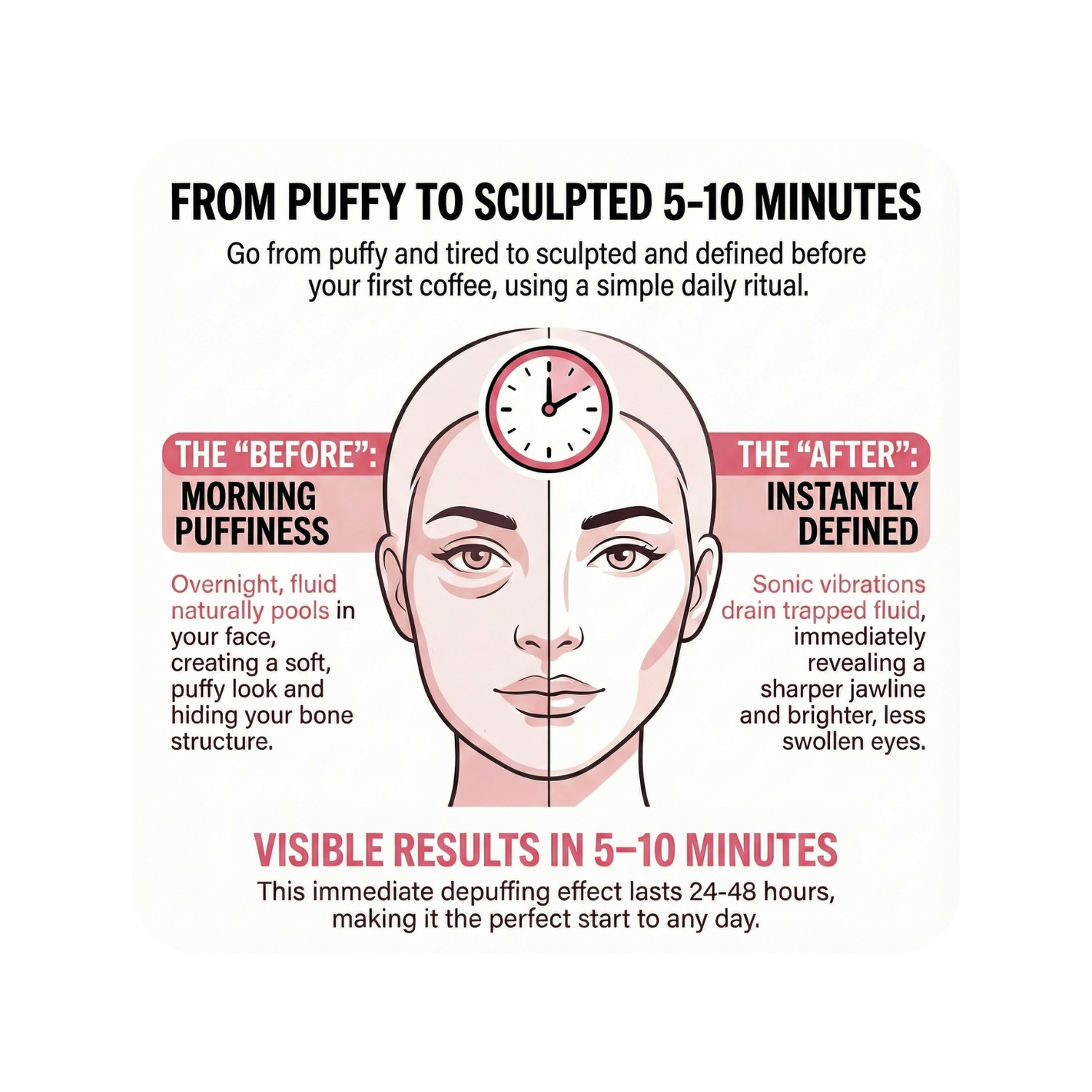 You'll see visible depuffing within 5–10 minutes. Your jawline looks sharper. Your eyes look brighter and more awake. The effect lasts 24–48 hours, perfect for morning prep before work or an event. And here's the bonus: daily use trains your lymphatic system to respond more efficiently, so baseline morning puffiness becomes noticeably less pronounced over time. This is why women make it non-negotiable.